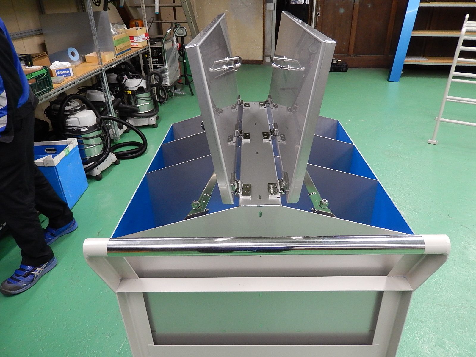 ステンレス製の開閉式フタ付き収納BOX製作取付。内側には製品を守る保護シートが貼付してあります。DSCN2698キャスターストッパー3連式 強力です。