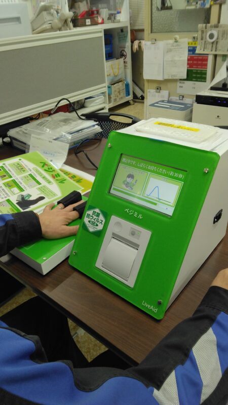 機器に指を差し込むと体内の野菜摂取度(主に緑黄色野菜)がわかるというものです。