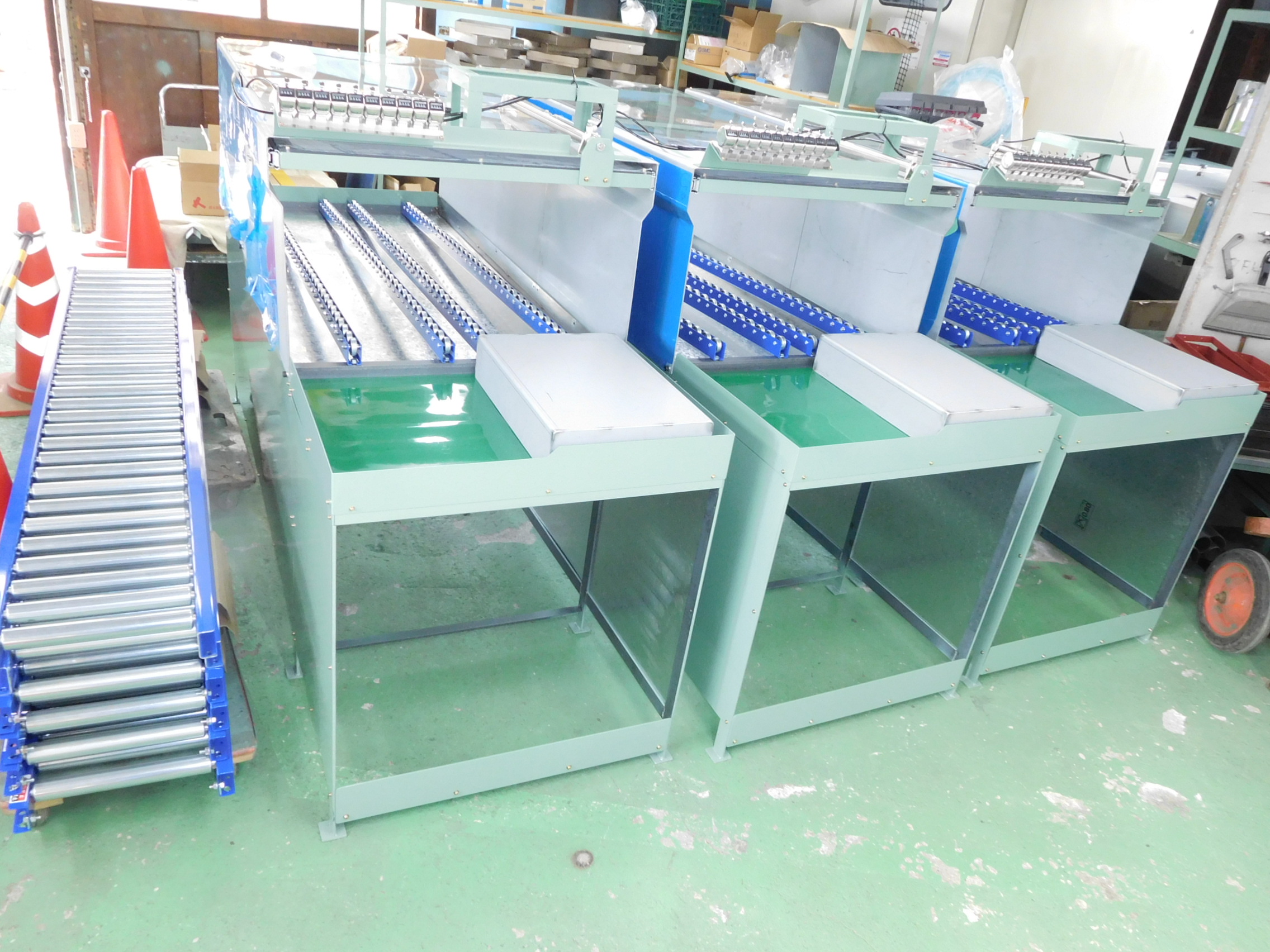 2018-03-15 作業台製作中 福島鈑金工業株式会社 お客様からご要望があった仕様で設計し作業台を製作中です。 コロコンローラー上段、ローラーコンベア下段(まだ未設置)を取付し製品を後ろから前に移動し作業するようになります。 エアシリンダーでシャッターも取付し異物混入防止対策もしております。 設計からお任せください!
