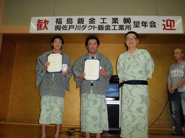 今年の永年勤続表彰は勤続10年で福島鈑金工業株式会社の駒木根主任、(有)佐戸川ダクト鈑金工業所の本田さんです。これから20年、30年とわが社の大切な社員として成長していって欲しいものです。記念品は「時を刻む」本人が選んだ腕時計です。