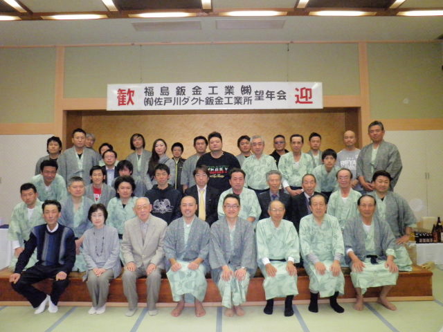 平成27年12月16日(水)、社内研修会の後に福島鈑金工業株式会社と(有)佐戸川ダクト鈑金工業所の望年会を行いました。まずは乱れる前に集合写真。弊社17名に対しゲスト23名の総勢40名の賑やかな望年会になりました。