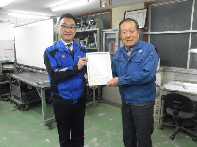 2019-02-20 平成31年度技能検定訓練校開校式 佐戸川ダクト鈑金工業所 平成31年度技能検定社内訓練校の開校式を行いました。 今年は建築板金ダクト板金作業2級を、入社2年目で若干19歳のK倉君が受験します。 その決意表明をしてもらいました。 その指導に当たってくれるのが、当社顧問、この道50年の大ベテランO内さんです。 社長の佐戸川が訓練指導員の委嘱状をお渡ししました。 長きにわたり技能検定員を務め、厚生労働大臣賞・叙勲も受けている、大先輩が技能の伝承をしてくれます。 普段の現場作業を行いながら、2月後半から7月末まで行います。 1発合格に期待しています。頑張れ、K倉君!